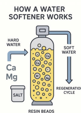 A water softener removes calcium and magnesium and replaces them with sodium (Na⁺) or potassium (K⁺) ions through a