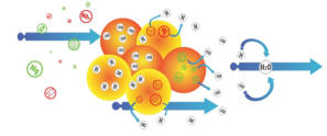 Water flows through a tank filled with resin beads coated with sodium ions (Na⁺).